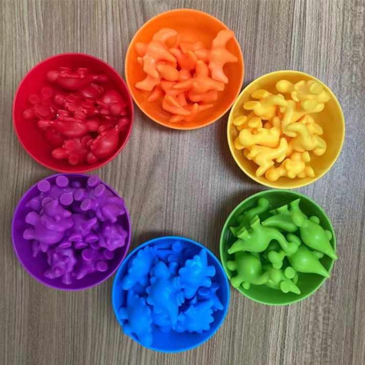- Wysypujemy wszystkie dinozaury na stół, następnie układamy 6 kubeczków