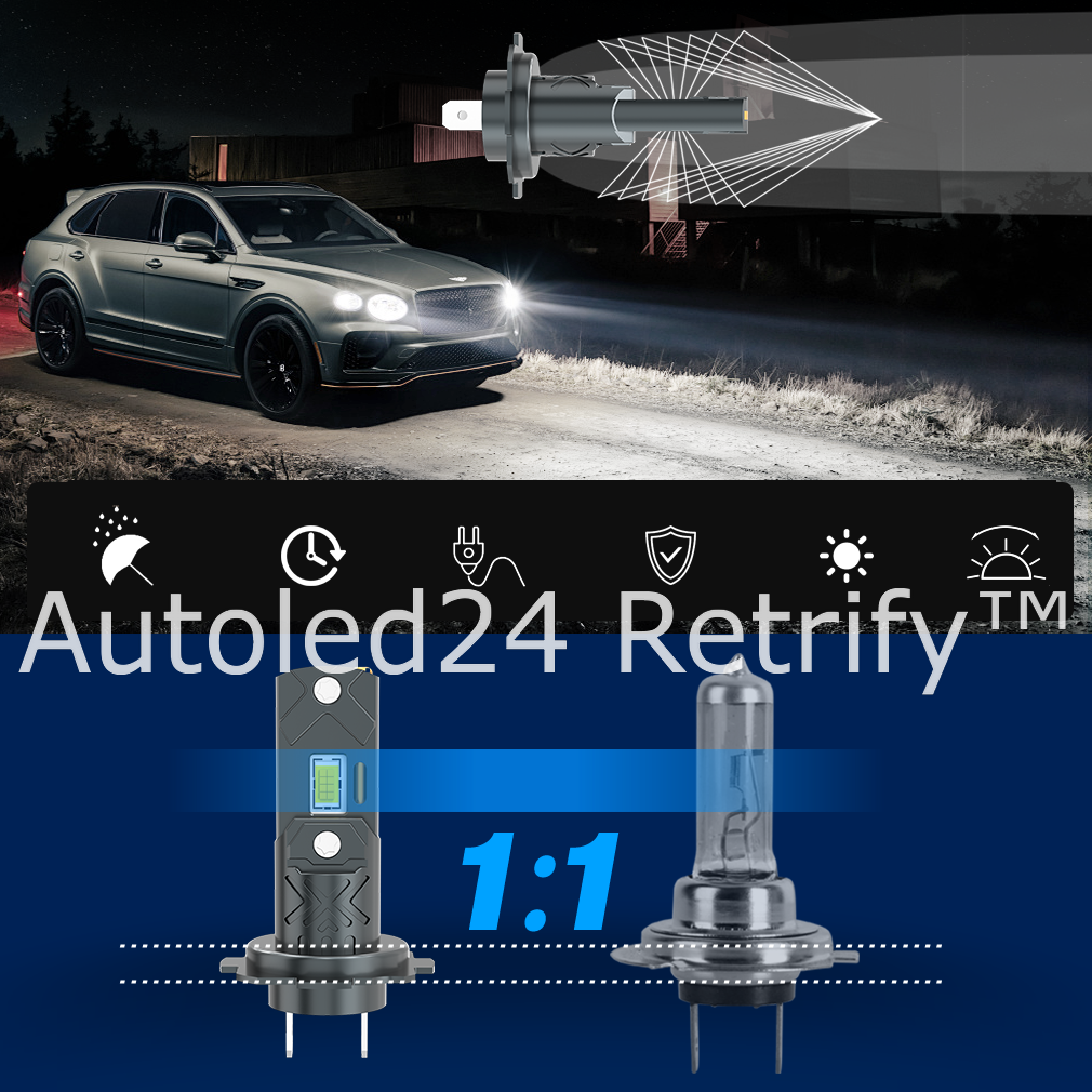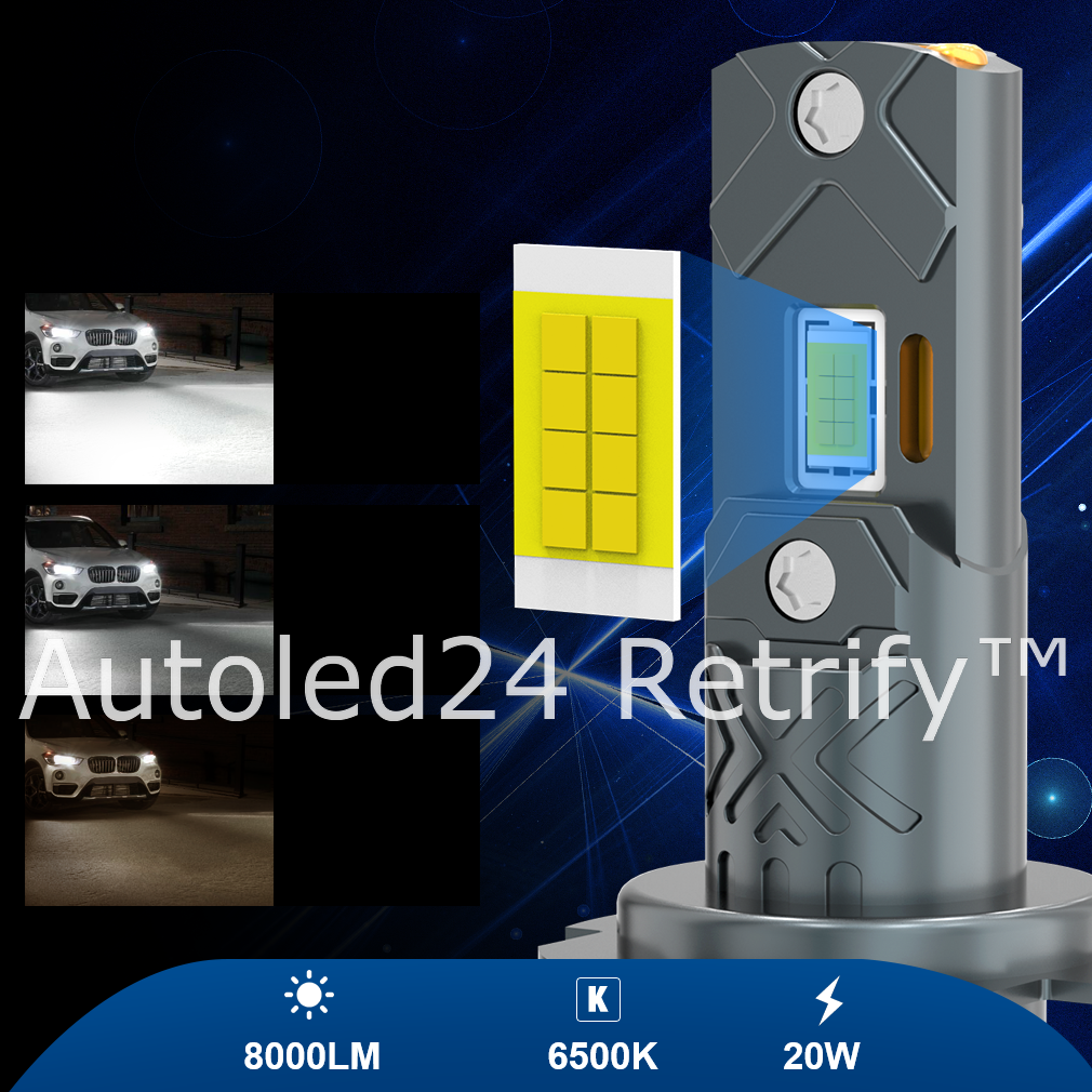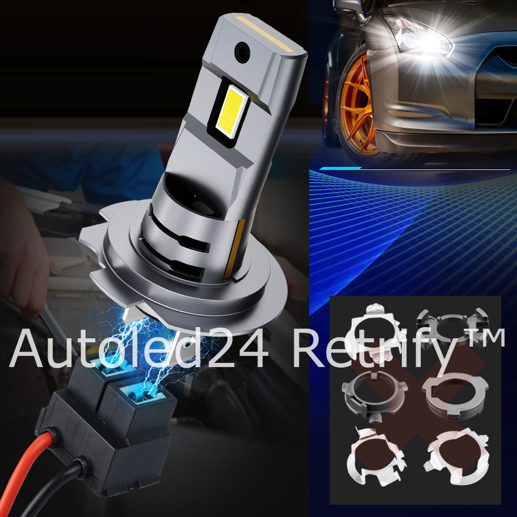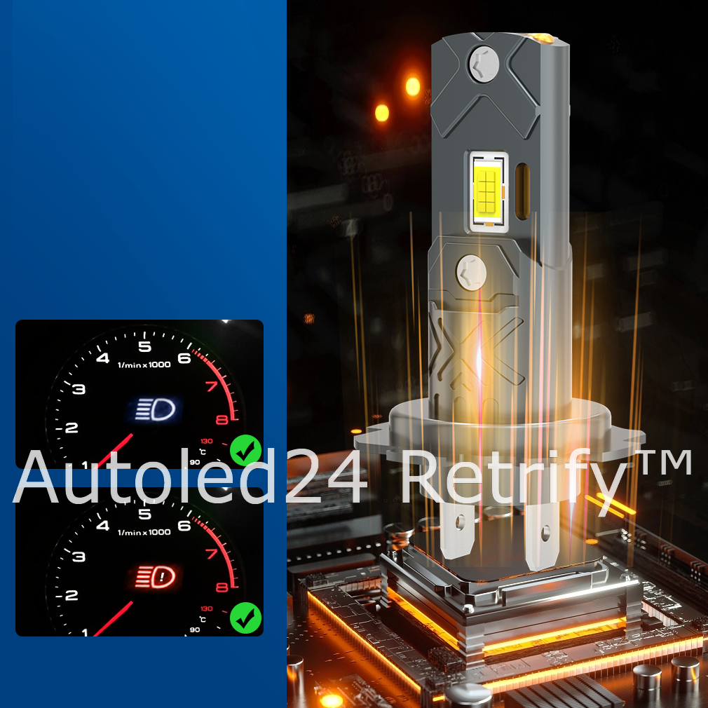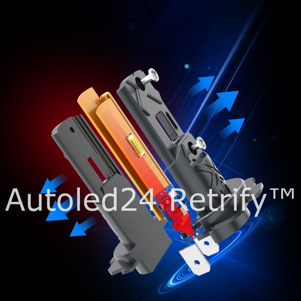 Idealnie bezgłośny system odprowadzania ciepła, brak problemów z uszkodzeniem lub głośną pracą radiatorów. Chłodzenie dwustopniowe z aluminiową obudową (aviation aluminium 6063) oraz miedzianym rdzeniem w korpusie retrofitu. Instalacja 1:1 jak standardowej żarówki halogenowej bez konieczności stosowania adapterów dla nietypowych gniazd żarówek.
