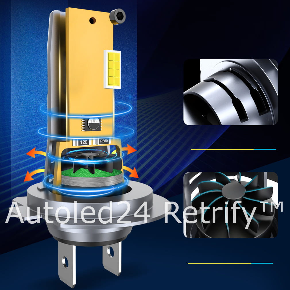 Poprzez umieszczenie radiatora aktywnego w korpusie retrofitu, możliwa jest instalacja 1:1 jak standardowej żarówki halogenowej bez konieczności stosowania adapterów dla nietypowych gniazd żarówek. Jest to jedyny model o konstrukcji 1:1 z aktywnym radiatorem, co umożliwia uzyskanie znacznie większej mocy i luminancji w stosunku do modeli bez aktywnego radiatora.